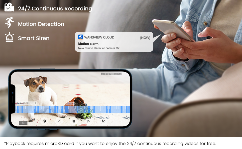 When emergency event happens, the camera also will sound a loud siren to alert the people/pet on the camera end. Two recording modes won't let you miss any moments. Now the 24/7 continuous recording can be activated manually on Cloud APP.